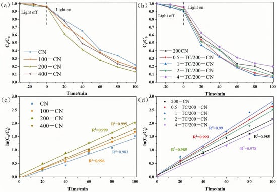 MB dye was a common cationic dye known for its environmental persistence, toxicity, carcinogenic properties, and mutagenicity. At doses greater than 5 mg/kg, MB’s monoamine oxidase inhibitory characteristics posed a threat not only to aquatic organisms within aquatic ecosystems but also had the potential to induce fatal serotonin toxicity in humans. Therefore, the removal of MB dye from wastewater was highly necessary. CN-based materials were commonly modified for applications in dye degradation [56,57]. In this study, the influence of modification strategies such as irradiation technology and the formation of complexes with TC on the performance of CN in degrading the organic dye MB was also investigated. In the degradation experiment, an adsorption–desorption equilibrium of MB dye was achieved through a 30 min dark reaction, with negligible changes in MB solution concentration before and after the reaction. Figure 6a illustrated that electron beam radiation modification significantly enhanced the photocatalytic performance of CN, with 200-CN exhibiting the optimal photocatalytic activity. Figure 6b showed the influence of composites formed by combining 200-CN with TC at different mass ratios on photocatalytic performance. When the doping mass ratio of TC is 0.5, 1, and 2, the photocatalytic activity significantly improved, with 1-TC/200-CN displaying the highest photocatalytic activity, achieving a degradation rate of 94% within 100 min. The possible reason for this phenomenon was that as the TC content increased, the close contact between the lamellar planes enhanced charge separation, reducing electron-hole pair recombination and thereby enhancing photocatalytic performance. Notably, when the mass ratio is 4, the photocatalytic activity of the composite was lower than that of 200-CN. This may be due to excessive TC shielding the active sites of 200-CN, creating a physical barrier during the catalytic process that reduced the surface area involved in the catalytic reaction, thereby decreasing the photocatalytic efficiency.