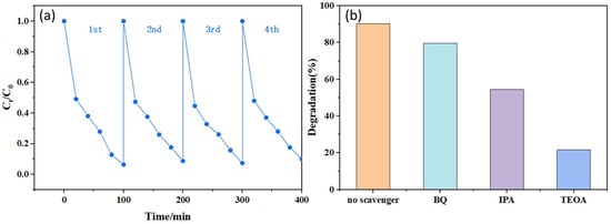 To further investigate the cyclic stability of the 1-TC/200-CN composite and the primary active species involved in its photocatalytic degradation process, we conducted cyclic experiments for photocatalytic degradation of MB dye and radical trapping experiments. In the cyclic experiments, the preliminary work is consistent with the photocatalytic degradation experiment. After each experiment, the samples are repeatedly washed with ethanol and water, centrifuged, and then dried to collect the samples. We evaluated the photocatalytic degradation rate of the composite after four consecutive cycles. As shown in Figure 7a, the degradation rate of MB remained at 90% after four cycles, indicating the excellent chemical stability of 1-TC/200-CN. In the radical trapping experiments, triethanolamine (TEOA), isopropanol (IPA), and β-benzoquinone (BQ) were used as scavengers for holes (h+), hydroxyl radicals (·OH), and superoxide radicals (·O2−), respectively, with a scavenger concentration of 0.5 mmol/L. As depicted in Figure 7b, the degradation rate of MB decreased after the addition of all three different scavengers, suggesting that h+, ·OH, and ·O2− all play significant roles in the degradation process. Compared to the other two scavengers, the addition of triethanolamine (TEOA) resulted in a substantial reduction in MB degradation efficiency, indicating that h+ play a crucial role in the degradation process.