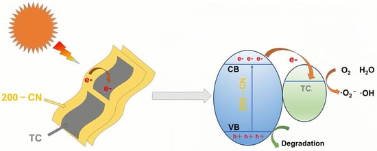Under solar irradiation, the photocatalytic mechanism of 1-TC/200-CN is illustrated as shown in Figure 8. TC and 200-CN are closely attached together in a lamellar form. Under light exposure, 200-CN is excited to produce a large number of electrons and holes. Due to the close contact between the interfaces and the excellent physicochemical properties of TC, the photogenerated electrons of 200-CN quickly migrate to the surface of TC. This greatly promotes the separation of photoexcited carriers in the 1-TC/200-CN composite material. Subsequently, the electrons aggregated on the surface of TC participate in the photocatalytic degradation reaction, significantly enhancing the photocatalytic degradation performance of the composite material for organic dyes.