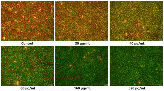 JC-1 staining was an experimental technique used to detect changes in mitochondrial membrane potential within cells. It formed aggregates of different colors depending on the membrane potential, reflecting the level of mitochondrial membrane potential through its distribution within mitochondria [60]. Under normal conditions, healthy mitochondria exhibited red fluorescence (JC-1 aggregates). When mitochondria are damaged, the mitochondrial membrane potential decreased, resulting in the appearance of green fluorescence (JC-1 monomers) within the mitochondria [61]. Therefore, in this study, the JC-1 staining method was employed to assess the effect of various concentrations of 1-TC/200-CN composites on the mitochondrial membrane potential of CAL-27 cells under photodynamic action. As shown in Figure 11, the control group exhibited strong red fluorescence and weak green fluorescence, whereas the 320 μg/mL group displayed an opposite pattern. Furthermore, as the concentration of the composites increased, the green fluorescence in the mitochondria became increasingly intense, while the red fluorescence gradually weakened, demonstrating a clear concentration-dependent trend. These results indicated that the 1-TC/200-CN composite material effectively induced apoptosis in CAL-27 cells under photodynamic action, with the mechanism closely linked to a significant decrease in mitochondrial membrane potential within the cells. Specifically, the composite material may exert its effect by interfering with or inhibiting the normal function of the main mitochondrial electron transport chain (ETC) complexes [62]. This interference may manifest as impacting the electron transfer efficiency between complexes or altering their redox states, thereby achieving precise regulation of the mitochondrial membrane potential. Ultimately, this series of actions lead to the apoptotic process in CAL-27 cells.