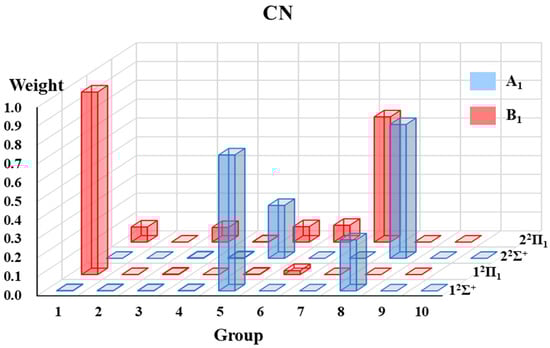 The VB structure weights gathered by groups for each state of the four radicals are displayed in Figure 2, Figure 3, Figure 4 and Figure 5. Since the 2Π state in the C∞v point group is in two-fold degeneracy, each corresponding to the B1 and B2 states in the C2v group, only the VB structural weights of the B1 states are illustrated.