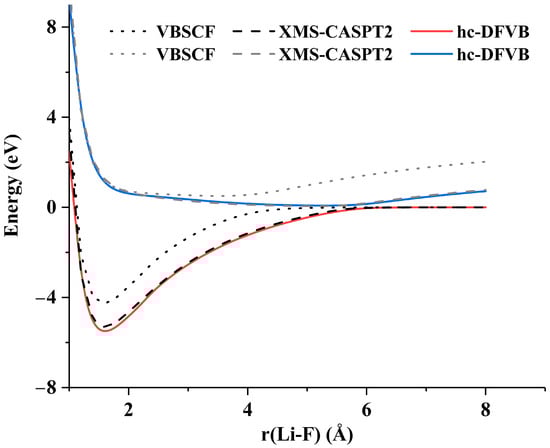 The PECs of the two lowest states of LiF calculated by XMS-CASPT2, VBSCF with HAOs, and hc-DFVB with HAOs and B3LYP functional.