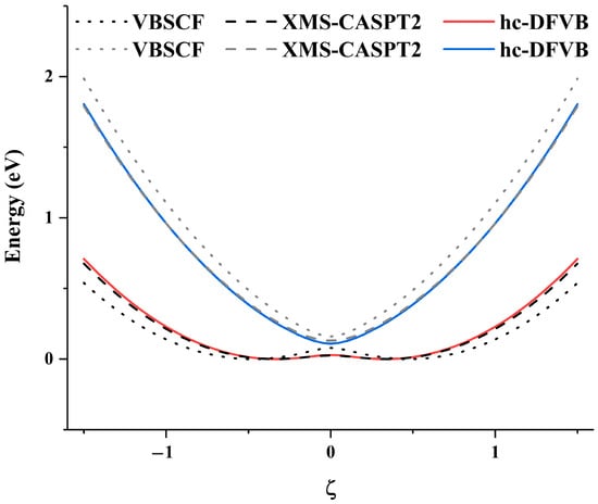 There are many VB studies on molecular excited states with modern classical valence bond methods, such as the studies on the lowest excited states (1Δg and 1Σg+) of O2 [36], the 1Δ and 1Σ+ excited states of NF [37], the V state of ethylene [38], and the lowest-lying singlet electronic states of O3 and SO2 [39]. All these studies showed that although VBSCF can sometimes give correct qualitative descriptions for the excited states, the inclusion of dynamic correlation is still required to give a quantitatively accurate description of the excited states. Furthermore, when electronic states with the same symmetry are degenerate or near-degenerate, they tend to interact strongly with each other to form a conical intersection. A multi-state (MS) treatment is usually required to describe the correct topography of adiabatic potential energy curves (PECs) at conical intersections [40]. Since most trajectories do not precisely pass through the conical intersection seam, the PECs near the conical intersection region are avoided along the path and are therefore known as avoided crossings. In the MS treatment, the state interaction is considered by the construction of an effective Hamiltonian and the adiabatic states are obtained by the diagonalization of the effective Hamiltonian at the last step. The most widely used MS methods include multi-state CASPT2 (MS-CASPT2) [41], multi-configuration quasi-degenerate perturbation theory (MC-QDPT) [42], and their extended formulations, namely XMS-CASPT2 [43] and XMC-QDPT [44]. Recently Truhlar et al. have developed a series of MS methods based on multiconfiguration pair-density functional theory [45,46,47].