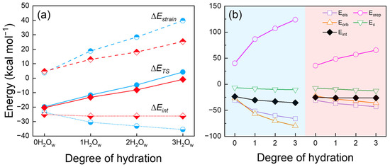 (a) Energy decomposition analysis (EDA) performed at the B3LYP-D3/ECP/d level for the TS of the microsolvated HO−(H2Ow)n=0–3 + CH3CH2Br reactions, comparing the inv-SN2 (red line) and anti-E2 (blue line) pathways. (b) Results of the sobEDA analysis at the same theoretical level for the TS of the microsolvated HO−(H2Ow)n=0–3 + CH3CH2Br reactions, presented with a red background for inv-SN2 and a blue background for anti-E2. Where ∆Eint: interaction energy, ∆Eels: electrostatic energy, ∆Ex: exchange energy, ∆Erep: Pauli repulsion, ∆Eorb: orbital interaction, ∆EDFTc: correlation energy, ∆Edc: dispersion correction. Among them, ∆Eint = ∆Eels + ∆Exrep + ∆Eorb + ∆Ec, ∆Exrep = ∆Ex + ∆Erep, ∆Ec = ∆EDFTc + ∆Edc.