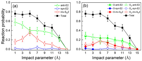 At a low collision energy of 0.04 eV, three reaction channels are observed in the HO−(H2Ow) + CH3CH2Br systems: anti-E2, syn-E2, and inv-SN2. Figure 3a illustrates the reaction probability, Pr(b), as a function of the impact parameter, b. In the microsolvation reaction, the anti-E2 and inv-SN2 pathways exhibit identical bmax values (15 Å) yet display markedly disparate reactivity trends. In the case of the anti-E2 reaction, the Pr(b) undergoes a pronounced decline within the range of impact parameters b = 1 to 5 Å. However, it exhibits a relatively high probability level at larger impact parameters. When the impact parameter exceeds 11 Å, the probability of the reaction decreases rapidly and reaches zero at 15 Å. In contrast, the Pr(b) for the inv-SN2 pathway reaches a maximum of 5 Å and gradually decreases to zero. This trend discrepancy suggests a competitive interplay between the SN2 and E2 channels, wherein the rise in the inv-SN2 channel’s reaction probability exerts an inhibitory effect on anti-E2. The reaction probability of the elimination pathway is consistently higher than that of the substitution pathway across the entire impact parameter range. This phenomenon is because the anti-E2 transition state has a looser geometry, leading to more reactivity at larger impact parameters [12,13]. The syn-E2 channel probability is independent of the impact parameter and does not compete with the two main pathways mentioned above due to the significant steric hindrance caused by the syn-coplanar conformation, which inhibits the reaction. Microsolvated bases can produce shapeshifting nucleophiles with varying nucleophilic centers, and prior research has demonstrated that the reactions involved in shapeshifting nucleophilic reagents are not competitive [35,36,41,42]. However, our findings indicate that the Ow- and O-channels exhibit comparable reaction possibilities, as shown in Figure 3b. which can be attributed to the frequent proton transfer in the entrance channel of the potential energy surface and the relatively shallow transition energy barrier (0.09 kcal mol−1) between HO−(H2Ow) and HOw−(H2O).