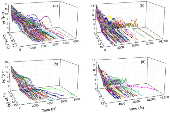 Dynamics simulations provide insights into the intricate atomic motions associated with different reaction mechanisms. In the HO−(H2Ow) + CH3CH2Br system, both substitution and elimination reactions occur through a combination of direct and indirect pathways (refer to Animations S1–S8 in the Supplementary Materials). In contrast to the gas phase HO− + CH3CH2Br reaction [51], water molecules inhibit the direct mechanism, facilitating the indirect mechanism, in which pre-mechanism is vital. For example, Figure 4a shows a snapshot of the trajectory of the pre-mechanism in the inv-SN2 pathway of the single hydrated system, where first the nucleophilic reagent HO−(H2Ow) approaches CH3CH2Br and is then trapped by the entrance channel potential well trap, crossing the Walden inversion transition state after interaction of about 5000 fs, followed by rapid segregation into nucleophilic substitution products. Figure 4b illustrates the details of atomic motions in the anti-E2 pathway, where the nucleophilic reagent HO−(H2Ow) is captured by the deep potential well after a collision with CH3CH2Br at ~1402 fs, forming a long-lived intermediate of ~2925 fs. Then, the base extracted β-H atom crosses the transition state of the anti-E2, followed by a fast segregation into the elimination product.