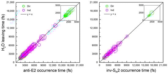 The statistical model for the HO−(H2O) + CH3CH2Br reaction with equilibrium microsolvation posits that the water molecule remains in interaction with the reactive system throughout the SN2 or E2 reaction, leading to the formation of water-solvated products. These solvated products may eventually dissociate if they possess enough energy. However, the dynamics of water solvation observed in the trajectories exhibit a distinctly different behavior from that predicted by the model, providing insight into why the reaction tends to favor the formation of isolated products. This discrepancy is illustrated by comparing the time for water to separate from the reaction system (i.e., HOH···O/Br breaking bond ≥ 2.2 Å) [57] with the time required for the base-induced elimination or substitution to occur. Figure 7 presents this information as a scatter plot, showing the prominent anti-E2 and inv-SN2 pathways with similar characteristics. For trajectories leading to the formation of bare ionic products, the departure of H2O during the SN2 reaction (Cα–O bond distance ≤ 2 Å) coincides with the displacement of Br− by HO−, while in the E2 reaction, the abstraction of β-H (HO–Hβ bond distance ≤ 1 Å) occurs simultaneously. In both cases, water departs at the moment when elimination or substitution takes place. This behavior represents the preferred hydrodynamics for multiple product channels, accounting for 94% of the solvation reactions observed.