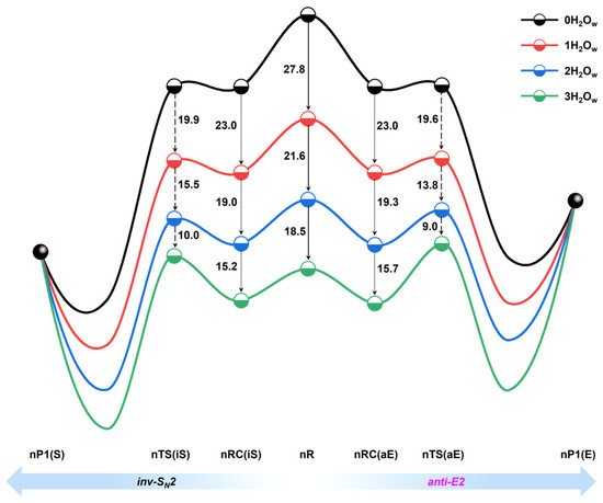 Bimolecular nucleophilic substitution (SN2) and base-induced elimination (E2) occupy a unique place in organic chemistry due to their apparent simplicity as well as utility, and they usually co-exist and compete [1]. Intensive experimental [2,3,4,5,6,7,8,9,10,11] and theoretical [12,13,14,15,16,17,18,19,20,21] investigation of SN2/E2 reactions over several decades has provided valuable insights into unraveling the origins of the competing mechanism. For instance, Bickelhaupt and Ren et al., in their study of the model reaction X− + CH3CH2Y, observed systematic periodic trends in the SN2 and E2 reactions. They further revealed that electronegativity, basicity, and steric effects influence the energy barriers of SN2/E2 processes, thereby altering the reaction preferences [22,23,24]. However, a clear distinction between SN2 and E2 reactions is a difficult challenge because several aspects have similar effects on the competing reactions: nucleophile/base attack [25,26], leaving group [17], reaction temperature [27], and solvent properties [18,28,29]. Among them, the solvent’s dielectric constant, steric effects, and dragging phenomena control the progression of ion–molecule reactions in solution by altering the geometry and electronic properties of the molecules [30,31,32]. The specifics of reactions occurring in solution are typically deduced rather than directly observed because the trajectories of molecules are heavily influenced by frequent collisions with a substantial volume of solvent [29]. This interaction obscures the ability to discern and evaluate the dynamic behavior of microscopic reaction mechanisms. Consequently, the concept of microsolvation, involving a small number of solvent molecules surrounding reactant ions, has attracted considerable attention as a transitional framework linking the gas and liquid phases [31,33]. It offers a bottom-up perspective for investigating solute–solvent interactions, thereby enhancing our comprehension of hydration reaction dynamics.
