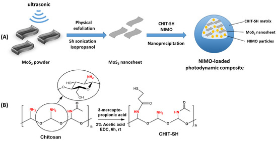 The objective of this work is to develop suitable NIR photo-responsive drug carriers for NIMO (Figure 1A) to decrease its adverse effects and improve its bioavailability. Despite having excellent levels of biocompatibility and biodegradability [43,44], CHIT’s poor solubility at physiological pH makes it unsuitable for use in the production of drug delivery systems. To increase the water solubility of CHIT, it was conjugated with 3-mercapto propionic acid to produce CHIT-SH (Figure 1B). Furthermore, the thiol moiety can also increase the exfoliation process of MoS2 nanosheet [3], which we employed as a carrier to initiate drug release based on the NIR photothermal conversion property of MoS2. Based on the nanoprecipitation strategy (Figure 1A), NIMO and MoS2 nanosheets were encapsulated within biocompatible and biodegradable CHIT-SH to produce NIMO-loaded photodynamic composite (NIMO-MoS2-CHIT-SH). This can improve the bioavailability of poorly water-soluble NIMO by reducing the drug’s crystallinity, which results in a higher dissolution rate and increased stability in an aqueous medium. Furthermore, the release of NIMO from the photodynamic composite can be modulated by the application of NIR light.