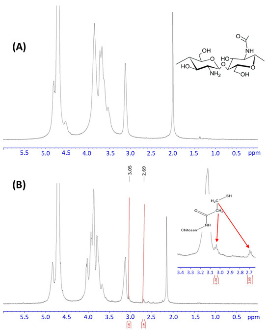 The 1H-NMR spectra were also recorded (see Figure 3) following the FTIR chemical characterization of CHIT and CHIT-SH. The CHIT-SH spectrum displays the typical chitosan peaks (Figure 3A) as well as two additional peaks at 2.69 and 3.05 ppm that we believe are related to the 3-mercaptopropionate moiety (Figure 3B).