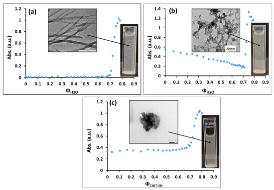 The solubility/precipitation properties of the NIMO and CHIT-SH were studied in the EtOH/H2O system to find a good strategy for producing a NIMO-loaded photodynamic composite by a simple precipitation method, as we previously reported [58]. NIMO (as a poorly water-soluble drug) shows good solubility in EtOH and can be precipitated by H2O, as presented in Figure 5a. The precipitation of ethanol-based NIMO solution required a large amount of water (~ФH2O = 0.68) to begin precipitation of micron-sized needle-like crystals of bare NIMO, even in the presence of MoS2, the precipitation of NIMO and MoS2 composite was occurring at (~ФH2O = 0.7) to form microstructure of composite as shown in Figure 5b.