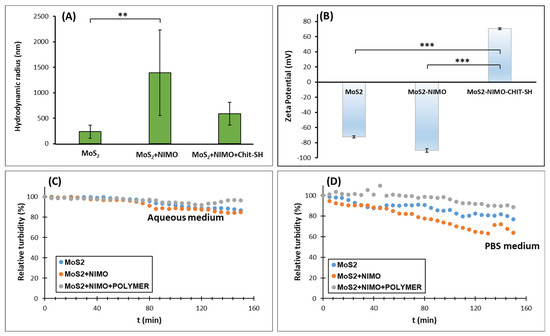 (A) Hydrodynamic radius for MoS2 nanosheet, MoS2-NIMO, and MoS2-NIMO-CHIT-SH composite; (B) the corresponding zeta-potential values of the samples. The time-dependent turbidity values of MoS2 nanosheet, MoS2-NIMO, and MoS2-NIMO-CHIT-SH composite dispersion (0.01% w/v) in (C) water and in (D) PBS medium. The particle size and the zeta potential measurements were statistically analyzed using a one-way ANOVA test followed by Tukey’s HSD post hoc test. The following designation was used for the levels of significance: ** p < 0.01; *** p < 0.001.