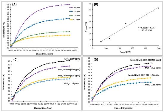 Photothermal excitation experiments: (A) temperature changes as a function of time at different MoS2 concentrations; (B) empirical relationship to the difference in temperature change (ΔT5min) as a function of MoS2 concentrations, the dash line displays the fitting line; (C) comparison of the temperature increase of MoS2 and MoS2-NIMO at different concentrations; and (D) between MoS2 and MoS2-NIMO-CHIT-SH composite at different concentrations.