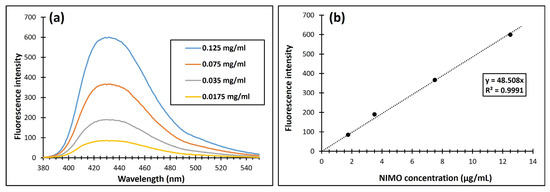 (a) Fluorescence intensity; and (b) calibration curve for NIMO by fluorescence measurements at λmax = 431 nm, the dash line displays the fitting line.