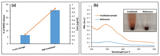 Based on this equation, the release of the NIMO drug can be determined in a simple, sensitive, and specific way. To investigate our idea that the release of NIMO can be triggered by using the NIR-irradiation approach, the concentration of the NIMO drug was determined in the presence and absence of NIR-irradiated, as shown in Figure 9a. The NIMO release in the NIR-irradiated sample was 25% (0.899 µg/mL) after 1 min irradiation, while the NIMO release (dissolution) in the non-irradiated samples was only 5% (0.23 µg/mL). To support and visualize our hypothesis, Sudan IV, as a poorly water-soluble lipophilic model dye, was added to the same system in place of the NIMO drug. By comparing the absorbance of the irradiated and non-irradiated samples, we found that the irradiation of MoS2 contributed to the diffusion of the poorly water-soluble dye and an increase in solution intensity, as seen in Figure 9b.