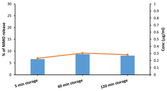 To further prove our idea that the NIR light irradiation of MoS2-containing composite particles is responsible for the release of the encapsulated drug, the NIMO concentration was compared at different storage times without NIR irradiation, as shown in Figure 10. As storage time increases, the increase in drug release becomes negligible, which means that the drug in its encapsulated form can be protected for a long time in an aqueous medium and can only be released by applying NIR radiation.
