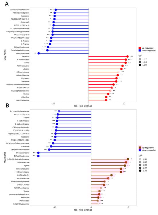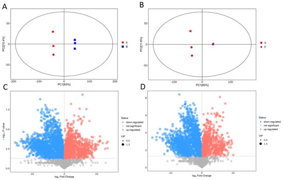 The volcano plots were created by combining the findings of the univariate and multivariate statistical analyses to test for different metabolites (Figure 1C,D). Every point on the volcano plot represented a peak. The vertical coordinate indicated the p-value of the Student’s t-test (derived from the negative of the logarithm of base 10) and the horizontal coordinate indicated the fold change of the group comparing each substance. The scatter size corresponded to the value of the variable importance projection (VIP) in the OPLS-DA model, where a larger scatter indicated a higher VIP value. Red points represented significantly up-regulated metabolites, blue points represented significantly down-regulated metabolites, and gray points represented metabolites that were not significantly different [30]. The volcano plot results showed that there were many types of differential metabolites in different metabolic systems, and further analysis of the key substances was needed.