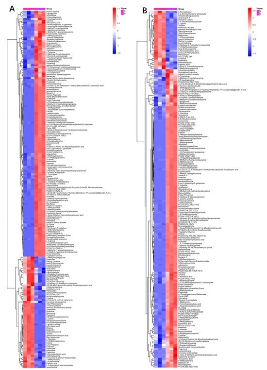 In addition, hierarchical clustering analysis (HCA) was performed in order to discover the characteristics of metabolite variation among experimental groups (Figure 2). The highly expressed substances in each group illustrated in the clustered heatmaps include the substances in Table 2, thus suggesting that these substances may be biologically similar/complementary in outcome and function and may be involved together in the same metabolic processes.