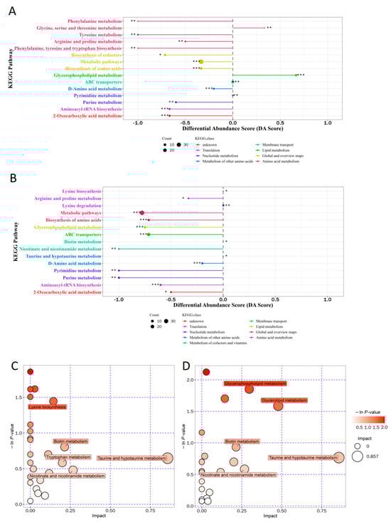 Functional annotation analysis of metabolomics: (A) differential abundance score for J-6 consortium vs. J-6 bacterial consortium; (B) differential abundance score for J-6 consortium vs. J-6 fungal consortium; (C) metabolic pathway analysis bubble plot for J-6 consortium vs. J-6 bacterial consortium; (D) metabolic pathway analysis bubble plot for J-6 consortium vs. J-6 fungal consortium. * stands for significance: * 0.01 < p < 0.05, ** 0.001 < p < 0.01, *** p < 0.001.
