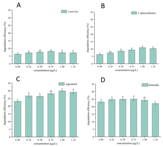 Verification of key interacting substances in the fungi–bacteria lignin degradation system: (A): lignin degradation efficiency of fungal culture systems adding taurine; (B) lignin degradation efficiency of fungal culture systems adding L-phenylalanine; (C) lignin degradation efficiency of bacterial culture systems adding ergosterol; (D) lignin degradation efficiency of bacterial culture systems adding betanidin). Different letters in the graph indicate significant differences (p < 0.05).
