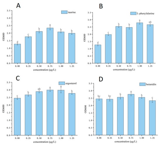 Verification of key interacting substances in the fungi–bacteria lignin degradation system: (A) biomass of fungal culture systems adding taurine; (B) biomass of fungal culture systems adding L-phenylalanine; (C) biomass of bacterial culture systems adding ergosterol; (D) biomass of bacterial culture systems adding betanidin). Different letters in the graph indicate significant differences (p < 0.05).