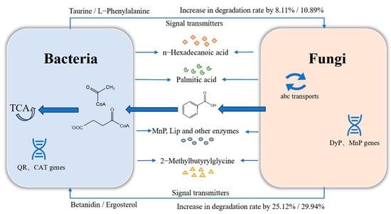Based on the above analysis, a hypothesis regarding the interaction mechanism of these key chemical currencies in the degradation of the lignin mixed system was formulated (Figure 7). Betanidin from fungi may play a role in regulating the osmotic pressure of bacterial cell membranes, while ergosterol could be involved in stress-adaptive regulation and enhancing stress resistance in bacteria. Additionally, L-phenylalanine from bacteria may be involved in inducing cellular metabolism in fungi, while taurine could play a role in stress-adaptive regulation and enhancing stress resistance in fungi.