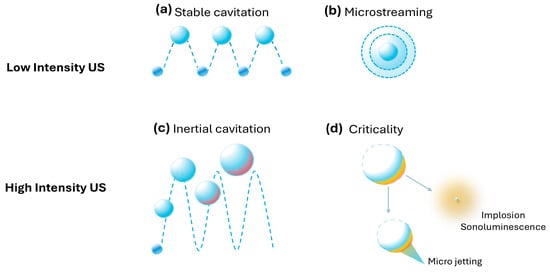 Principles and mechanisms of continuous low and high-intensity ultrasound. (a) Stable cavitation refers to the oscillation of gas bubbles in a liquid of known viscosity under the influence of low-intensity ultrasound (US). The bubbles expand and contract rhythmically without collapsing, creating micro-level mechanical effects. (b) Microstreaming describes the small-scale fluid movement caused by the oscillations of stable cavitation bubbles. This phenomenon enhances mixing and can influence cellular and molecular processes. (c) Inertial cavitation occurs when bubbles generated by high-intensity US collapse violently after expanding to a critical size. This results in localized shock waves and high-energy release. (d) Criticality represents the extreme outcomes of inertial cavitation, such as implosion, which generates high temperatures and pressures, sonoluminescence, the emission of light during bubble collapse, and microjetting, where focused liquid jets are ejected, causing significant localized impact.