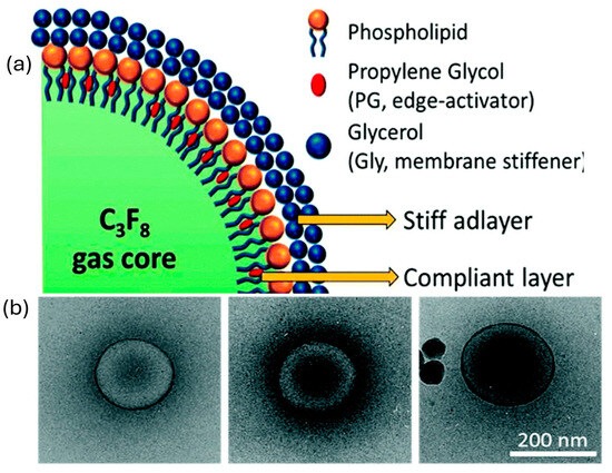 Consisting of an echo-contrast gas and various mono and bilayer configurations, nanobubbles have demonstrated multifunctional capabilities acting as drug delivery vehicles and stable imaging contrast agents in vitro [56,57]. However, when subjected to the continuous insonation and extreme oscillations encountered in vivo, NBs exhibit reduced lifetimes and poor signal performance. A potential solution to these limitations was proposed by Leon et al. [58], in which the contrasting elastic properties common to multilayer bacteria envelopes and human skin were incorporated into the construction of a biomimetic (propylene glycol-glycerol-phospholipid) PG-Gly-PL shell (Figure 2). In theory, an artificial shell with biomimetic features would result in the NBs dissipating excess energy and stress in a similar manner to their natural counterparts, thereby extending their half-life. Upon examination, the resultant biomimetic perfluoropropane NBs exhibited ultra-stable resilience and toughness with an in vivo half-life of 18.32 ± 0.40 min. A schematic of the ultrastable NBs is depicted in Figure 2.
