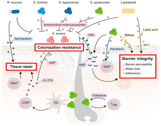 Regulating barrier function. Host–microbiota interactions involve complex mechanisms among species like Staphylococcus hominis, S. lugdunensis, S. epidermidis, lactobacilli, and Roseomonas mucosa, which secrete antimicrobial peptides (AMPs) inhibiting Staphylococcus aureus. S. epidermidis interacts with dendritic cells via hair follicles, stimulating IL-17A-producing CD8+ T cells to boost host AMP secretion and tissue repair. It also induces regulatory T cells (Tregs) early in life, fostering tolerance to commensals. The aryl hydrocarbon receptor activation by S. epidermidis drives keratinocyte production of β-defensin, preserving barrier integrity. Its sphingomyelinase supports ceramide synthesis in the stratum corneum. R. mucosa aids tissue repair by producing sphingolipids and suppressing S. aureus. Riboflavin from microbes activates invariant T (MAIT) cells for tissue repair, while lactobacilli secrete lactic acids, acidifying the skin and inhibiting pathogens. Reproduced with permission [94].