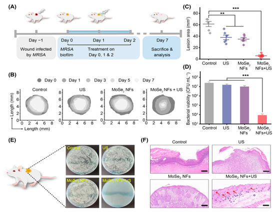 In vivo biofilm eradication and bacterial killing by MoSe2 NFs: (A) experimental schedule; (B) lesion traces over 7 days; (C) relative lesion area variation after 7 days; (D,E) MRSA viability at infection sites; (F) H&E staining of skin tissues (scale bars = 200 μm; arrows indicate hair follicles). Error bars represent SD (n = 6), with significance levels ** p < 0.001 and *** p < 0.0001. Reproduced with permission [145] from the American Chemical Society.