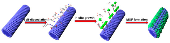 Metal oxides [8,9], hydroxides [10,11], and sulfides [12,13,14] have been widely studied as electrode materials for supercapacitors. Other than inorganic solids, metal–organic frameworks (MOFs) with a porous structure and tunable functionality also show excellent potential applications for electrochemical energy storage [15,16,17]. The central metal ions of MOFs can perform as active sites for redox reactions and the controllable pore structure can provide open channels for the transmission of the electrolyte [18,19]. For instance, Wang et al. [20] synthesized a Co-based layered MOF, which showed a high specific capacitance, good rate capability, and long-term cycling life in 1M KOH. Guo et al. [21] prepared hierarchical porous Zr-MOFs as electrode materials for supercapacitors, showing a specific capacitance of the prepared HP-UiO-66 of 849 F g−1 at a current density of 0.2 A g−1. Liu et al. [22] prepared a Mn-based MOF by a simple solution method; due to its 3D structure, it reached an admirable specific capacitance of 832.6 F g−1 at 1 A g−1. The cuboid Ni-MOF fabricated by He et al. also exhibited a high specific capacitance of 804 Fg−1 at 1 Ag−1 [23]. However, poor electrical conductivity largely impedes the potentiality of MOFs to construct high-performance electrodes in supercapacitors. To improve the electrical conductivity, hybridizing conductive additives, such as carbon materials [24], conducting polymers [25], and metal foams [26] is an effective strategy. Zhou et al. [24] reported that capacitance performance can be successfully improved by the hybridization of Ni-MOFs with graphene nanosheets. The good electronic conductivity of graphene can enable excellent electron transportation for boosting the performance. Zhang et al. [27] have grown CoNi-MOF nanosheets on carbon fiber paper, which displayed a high specific capacitance of 2033 F g−1 at 1 A g−1. Ni-MOF nanosheets were grown on Ni foam via a hydrothermal method reported by Wang et al. [26]. The as-prepared Ni-MOF/Ni foam exhibited a high specific capacitance with an outstanding cyclic stability. In addition, a Ni-doped Mn-MOF synthesized by Liu et al. [28] showed a high specific capacitance of 1676.6 F g−1 at 1 A g−1. However, all these grown processes are conducted by mixing substrates with metal precursors, which may lead to the instability of growth in MOFs and make it difficult to meet the needs of structural control.