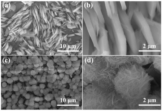 SEM images of (a,b) Ni-MOF/NF-s and (c,d) Ni-MOF/NF.