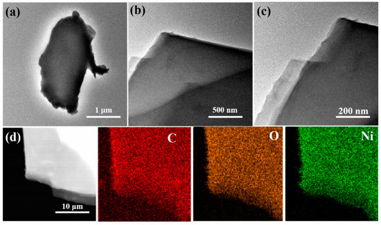 TEM images of (a–c) Ni-MOF/NF-s and (d) the elemental mapping images of Ni, C, and O.