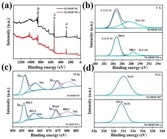 (a) XPS survey, (b) XPS C 1s, (c) XPS Ni 2p, and (d) XPS O 1s of Ni-MOF/NF-s and Ni-MOF/NF.