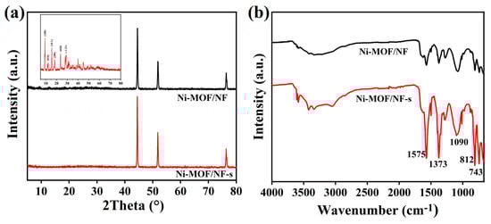 It can be seen from the XRD pattern that all samples have a high intensity peak at about 45°. Because of the high phase strength of nickel foam, the crystal structure of all samples is difficult to find. Therefore, Ni-MOF samples without nickel foam were prepared, and the corresponding XRD characterization is shown in Figure 5a. Significant peaks at 9.2°, 12.1°, 15.6°, 18.5°, 24.0°, and 29.0° (CCDC no. 638866) are similar to reported MOFs synthesized with a metal center Ni2+ and the organic ligand TPA [33,34], which can be related to [Ni3(OH)2(C8H4O2)2(H2O)4]·2H2O. An FT-IR spectrograph was used to further analyze the components of Ni-MOF/NF-s and Ni-MOF/NF. The peaks appearing at ca. 743, 812, 1090, and 1373 cm−1 are related to the deformation vibration of the aromatic C-H bonds of TPA linkers. Furthermore, the peaks present at ca. 1575 cm−1 correspond to the stretching vibration of the -COO− in TPA. In addition, the broad peak at around 3400 cm−1 can be assigned to the adsorbed H2O molecules [35].