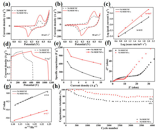 The electrochemical performance of Ni-MOF/NF-s and Ni-MOF/NF: (a) CV curves at 5 mV s−1, (b) CV curves at 50 mV s−1, (c) b-value determination of the peak currents of CV curves, (d) GCD curves at 1 A g−1, (e) specific capacities at 1–10 A g−1, (f) Nyquist plots, (g) linear relation of Z’ vs. ω−1/2, and (h) cycling stability at 10 A g−1.