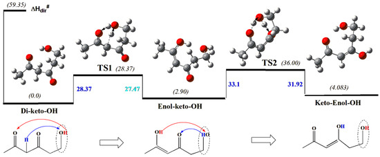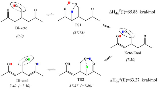 The uncatalyzed (direct) H-transfer (keto–enol tautomerization) in the gas phase is typically a high-energy process encountering a sizable activation barrier due to the formation of the small (here, four-membered) strained-ring transition states (top part of the Scheme 2). However, various acid-base catalysts, biocatalysts (enzymes), and molecular catalysts are known to assist tautomerization and reduce the barrier. Solvents can also affect these processes in the condensed phase depending on the polarity of the TS. Polar media typically favors the keto form (see, e.g., [80,94]) due to the higher polarity of keto forms in polar liquids. The di-keto form of acetylacetone, for instance, predominates both in water and DMSO, while the enol form is more stable in non-polar CCl4 in accordance with corresponding dipole moments [88]. At very low temperatures, in liquids and the solid state, tunneling also significantly impacts the rate parameters [85,86].
