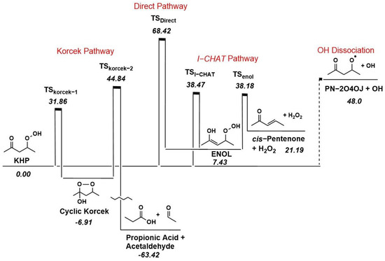 Potential energy diagram for I-CHAT, Direct, Korcek, and OH dissociation KHP pathways. Enthalpies (kcal/mol) are relative to the KHP baseline.