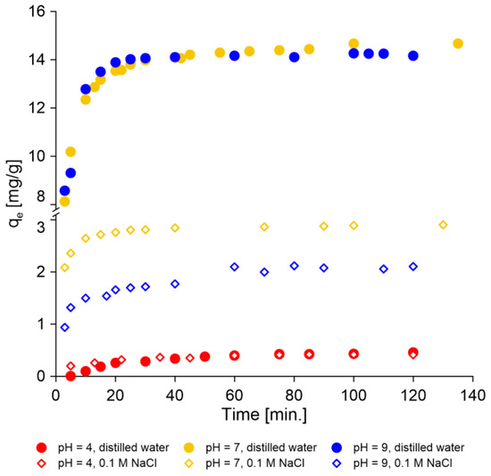 The contact time significantly influences the sorption capacity of sorbent. As can be seen in Figure 3, the equilibrium state was established very quickly, after just 20 min of phase contact time at pH 7 and 9. In the case of sorption in an acidic environment (pH 4), the process was much slower and took about 80–90 min. The equilibrium state was established during the sorption of thiophenol on sepiolite for a longer period and lasted about 100 min [14]. On the other hand, the time required to reach sorption equilibrium for Acid Blue 113 on Amberlite IRA 402 was 90 min [54].