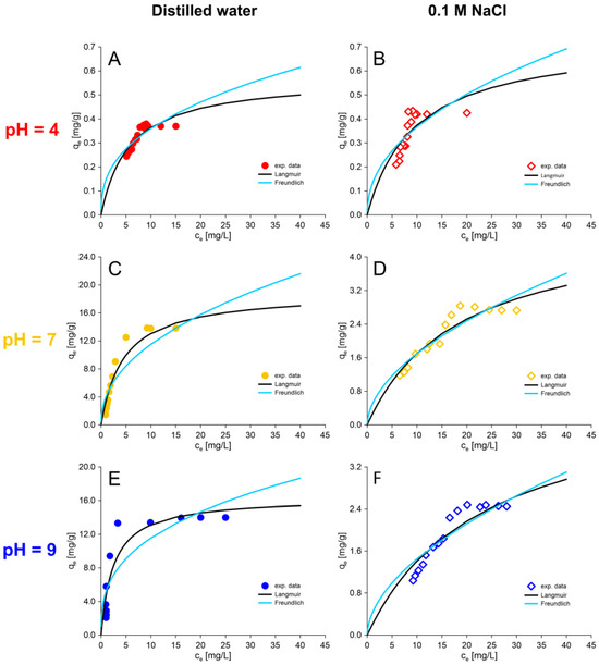 Isotherm models for experimental data of the thiophenol sorption process on AmberLite®IRA402Cl at pH 4, 7 and 9 with different ionic strengths: (A) Distilled water, pH = 4; (B) 0.1 M NaCl, pH = 4; (C) Distilled water, pH = 7; (D) 0.1 M NaCl, pH = 7; (E); Distilled water, pH = 9; (F) 0.1 M NaCl, pH = 9.
