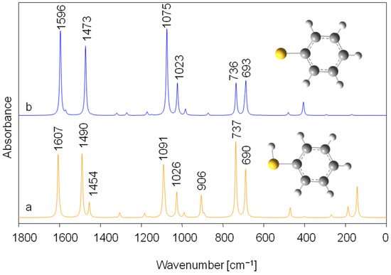 Theoretical (DFT/PCM/B3LYP/6-31g**) infrared spectra of thiophenol (a) and thiophenolate anion (b) in the spectral range of 1800–0 cm−1.