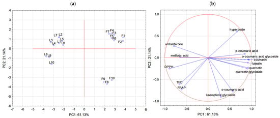 Principal component analysis results: (a) projection of analysed flowers and leaves of Melilotus albus and Melilotus officinalis (F1–F7: M. albus flowers; F8–F10: M. officinalis flowers; L1–L7: M. albus leaves; L8–L10: M. officinalis leaves); (b) selected variables (individual phenolic compounds, antioxidant activity, and total phenolic compound content—TPC) as function of PC1 vs. PC2.