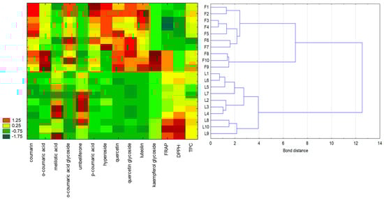 Hierarchical clustering analysis and heatmap visualisation of the analysed flowers and leaves of Melilotus albus and Melilotus officinalis (F1–F7: M. albus flowers; F8–F10: M. officinalis flowers; L1–L7: M. albus leaves; L8–L10: M. officinalis leaves), based on the content of individual phenolic compounds, the antioxidant activity, and the total phenolic content (TPC). The cluster analysis was performed using standardised data. The colours on the heatmap represent the values of individual parameters, with red indicating high values and dark green indicating low values.