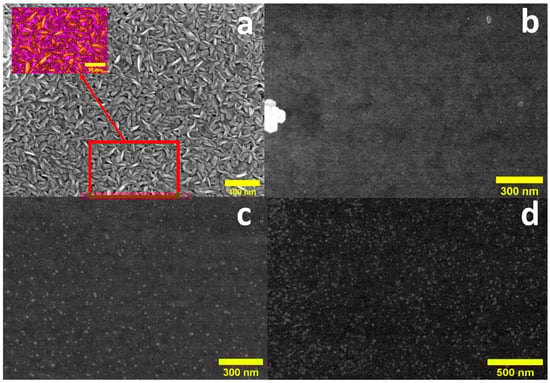 SEM images for (a) vertically aligned WS2-WO3, and after (b) 5 s, (c) 10 s, and (d) 15 s of Ag functionalization.