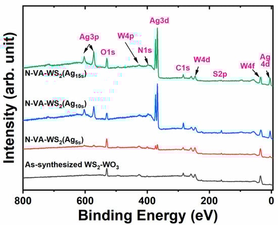 Then, the X-ray photoelectron spectroscopy (XPS) survey spectra revealed a prominent O1s peak at ~531.5 eV. The intensity of this peak exhibited a slight decrease in the N-VA-WS2(Ag10s) sample, while an increase was observed in the N-VA-WS2(Ag15s) sample. A detailed core-level analysis via XPS was conducted for various elemental regions, specifically W4f, S2p, and N1s, which are centered at 32.5, 161.8, and 399.6, respectively [23].