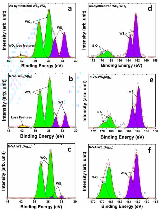 XPS core levels of (a–c) W4f and (d–f) S2p regions of the as-synthesized WS2-WO3, the functionalized N-VA-WS2(Ag5s), and N-VA-WS2(Ag15s), respectively. The open dots represent the data points, while the red line indicates the outcome of the fitting process.