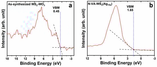 The valence bands of the as-synthesized vertically aligned WS2-WO3 and the functionalized sample N-VA-WS2(Ag15s) are shown in Figure 5. The valence band maximum (VBM) is identified at the intersection of the baseline and the slope of the edge, located at 0.45 eV. WS2 contributes to the valence band through the W(5d) states, S(3p) states, and a prominent W(5d)–S(3p) coupling [27,28]. WO3 contributed to the valence band with O(2p) states. Notably, the shoulder observed at 1.5 eV is attributed to the substantial presence of oxygen, indicative of WO3 [29,30]. The valence band of the as-synthesized WS2-WO3 extends over approximately 10 eV (Figure 5a).