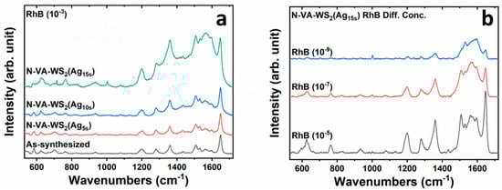 The SERRS spectra of Rhodamine B (RhB) collected on the functionalized samples, namely N-VA-WS2(Ag5s), N-VA-WS2(Ag10s), and N-VA-WS2(Ag15s), exhibit intense Raman bands. The most significant enhancement was observed for the sample functionalized for 15 s, N-VA-WS2(Ag15s), as shown in Figure 7a. This remarkable signal enhancement indicates the potential of the new hybrid nanocomposite materials as highly effective SERRS platforms. The substantial improvement in the SERRS response suggests that the specific functionalization conditions, particularly the 15 s treatment, have resulted in the creation of an optimal surface structure and morphology that can efficiently amplify the Raman scattering of the adsorbed RhB molecules. To further evaluate the sensitivity and limit of detection (LOD) of the N-VA-WS2(Ag15s) SERRS substrate, the detection of RhB at lower concentrations, including 10⁻5 M, 10⁻7 M, and 10⁻9 M, was tested. This assessment of the LOD will provide valuable insights into the practical applicability of this hybrid nanocomposite material for the ultrasensitive detection of trace-level analytes using SERRS technology.