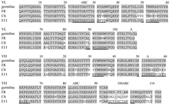 The sequence alignments of variable regions of anti-NP antibodies F8, C6, and E11. The gray boxes indicate the sequence similarity to a germline-type antibody and F8. The CDR regions are underlined. The residue number and CDR regions are based on Kabat et al. (1991) [].