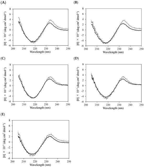 The anti-NP scFv antibodies overexpressed in Escherichia coli as inclusion bodies were solubilized with guanidine hydrochloride and were refolded by dilution in denaturing reagents. The refolded scFvs were purified using NP-conjugated bovine serum albumin (NP-BSA) and size-exclusion chromatography (SEC). The monomeric fractions of the scFvs were separated from the multimeric fractions using SEC. The far-UV CD spectra of the purified monomers showed a local minimum at 218 nm and a local maximum at 232 nm, indicating that the anti-NP scFv antibody was correctly folded (Figure 2 and Figure S1). The secondary structures remained almost unchanged upon antigen binding (Figure 2 and Figure S1).